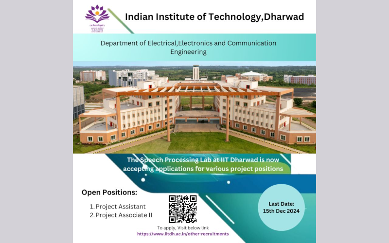 Indian Institute of Technology Dharwad is currently inviting applications for a range of project positions in the Speech Processing Lab led by Prof. Mahadeva Prasanna.